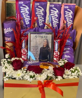 Real roses & chrysanthemum flowers + chocolates + Crystal printing