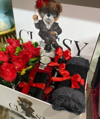 This gift includes a Teddy bear & plexy box filled with chocolates