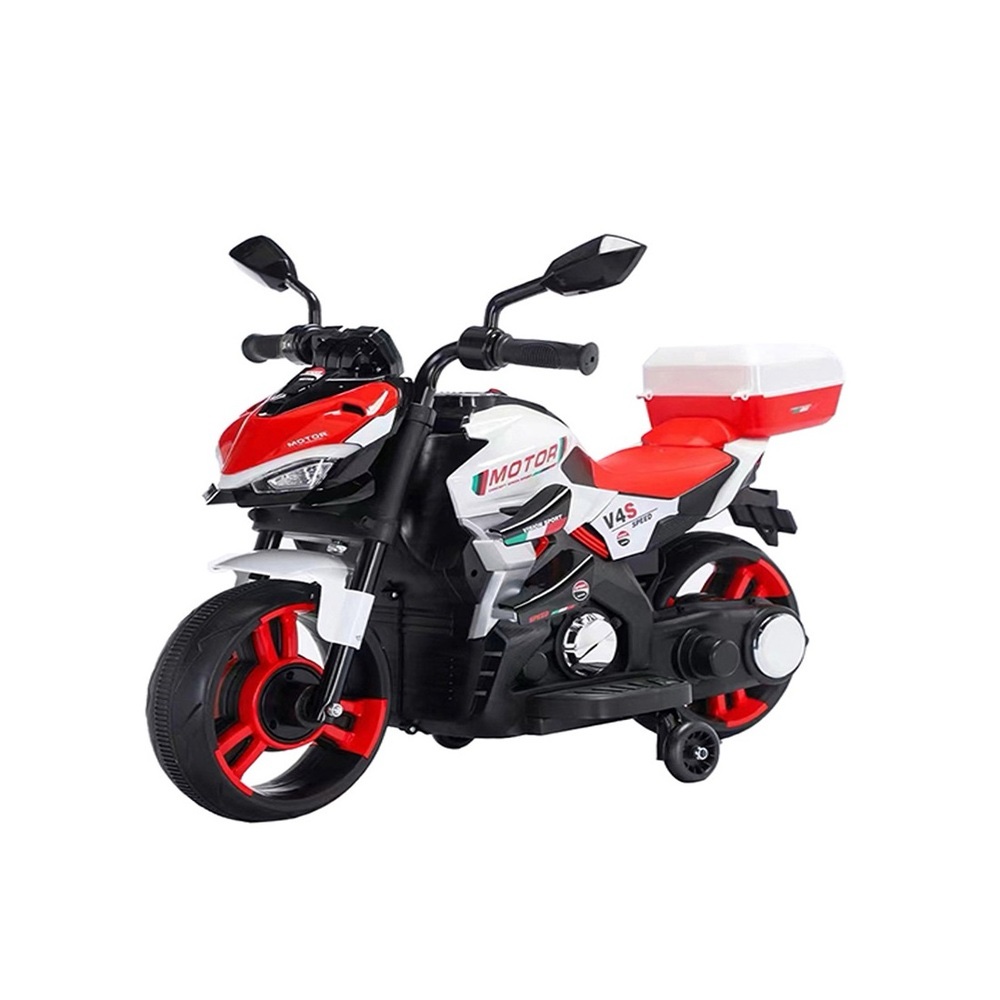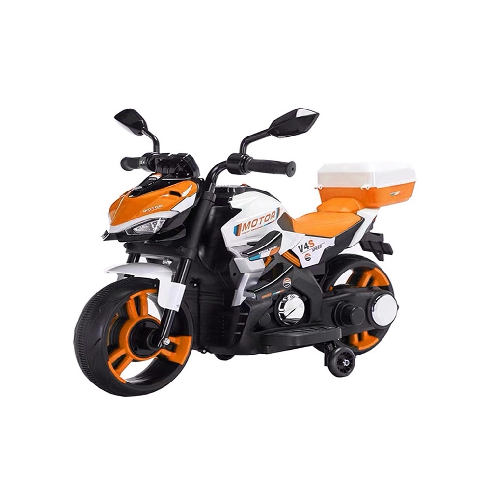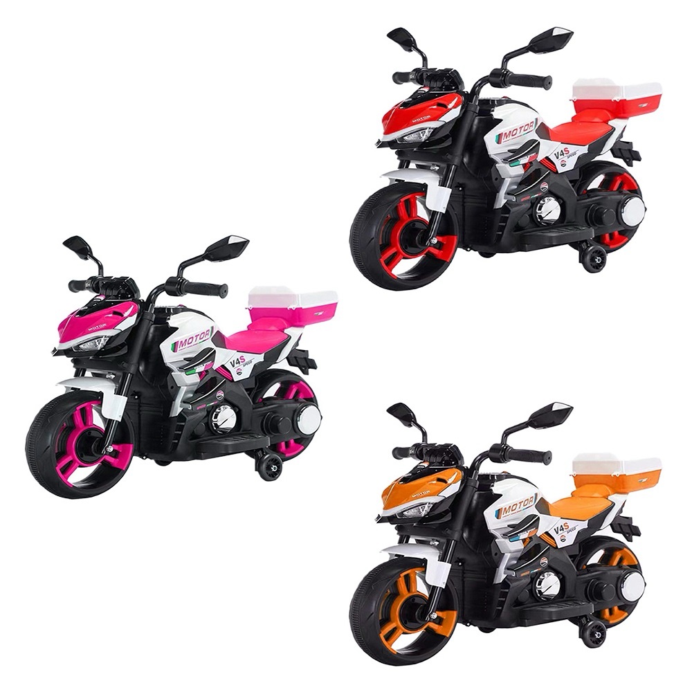 Sporty electric kids motorcycle. Realistic design with aerodynamic details. Front LED headlights for visibility and style. Functional rear storage trunk. Dual 12V 4.5Ah rechargeable batteries. Smooth 380 motor performance. Progressive acceleration with soft start. Stable 3-wheel EVA design for balance. Durable high-quality PP plastic body. Lightweight yet stable construction. Rearview mirrors for realistic riding experience. Ergonomic seat and child-friendly controls. Ideal for coordination and confidence development. Safe ride-on motorcycle for kids. Recommended age range: 1–3 years. Encourages outdoor play, balance, and coordination.