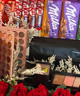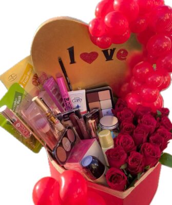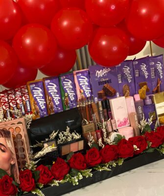 This gift includes a Teddy bear & plexy box filled with chocolates