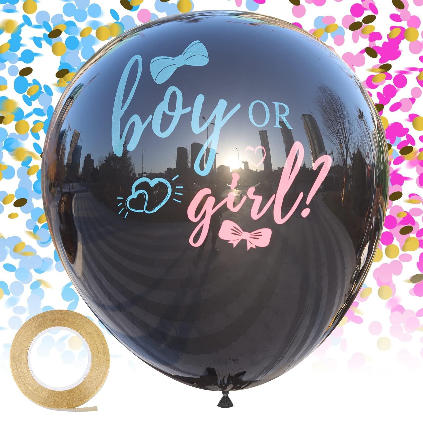 36 inch boy or girl balloon + 1 pink confetti + 1 blue confetti + 32 ft ribbon