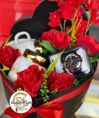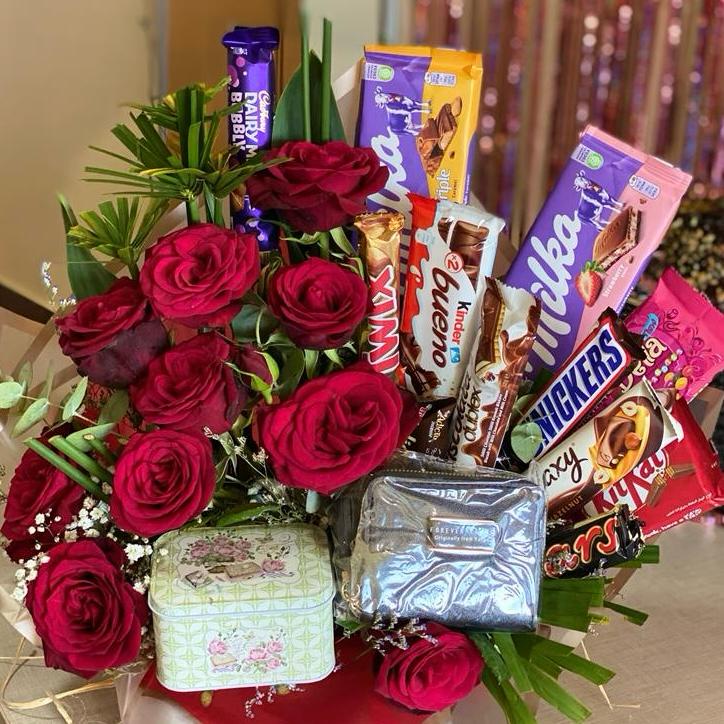 Real roses flowers + chocolates + wallet + accessories box includes neckless & bracelet & set of rings